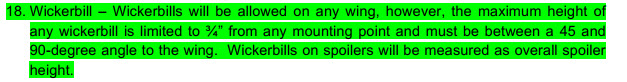 The main rule change in Aero has to do with wicker bills (aka gurney flaps). They will be limited to 3/4″ and will be included in the overall height/size limitations.